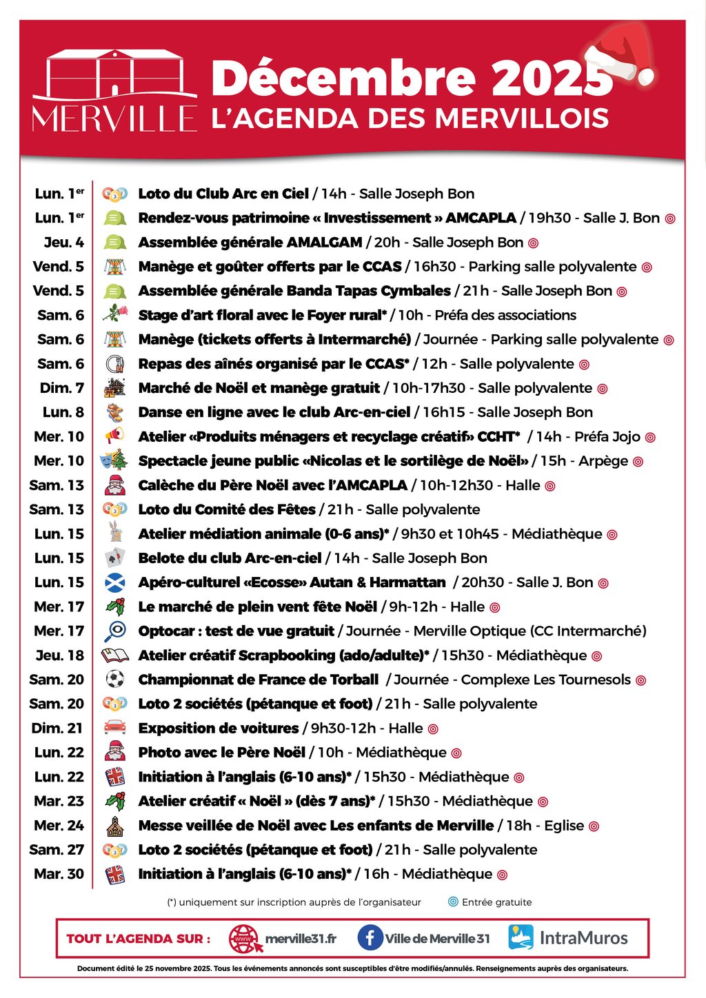 Avec l'arrivée du mois de décembre, ce sont les festivités de Noël qui débutent ! Manège gratuit, spectacle de Noël offert aux enfants, présence du Père Noël sur le marché, avec sa calèche dans les rues de Merville (AMCAPLA) ou à la médiathèque... De nombreuses animations permettront aux enfants (et aux plus grands) de profiter de la période des fêtes de fin d'année !