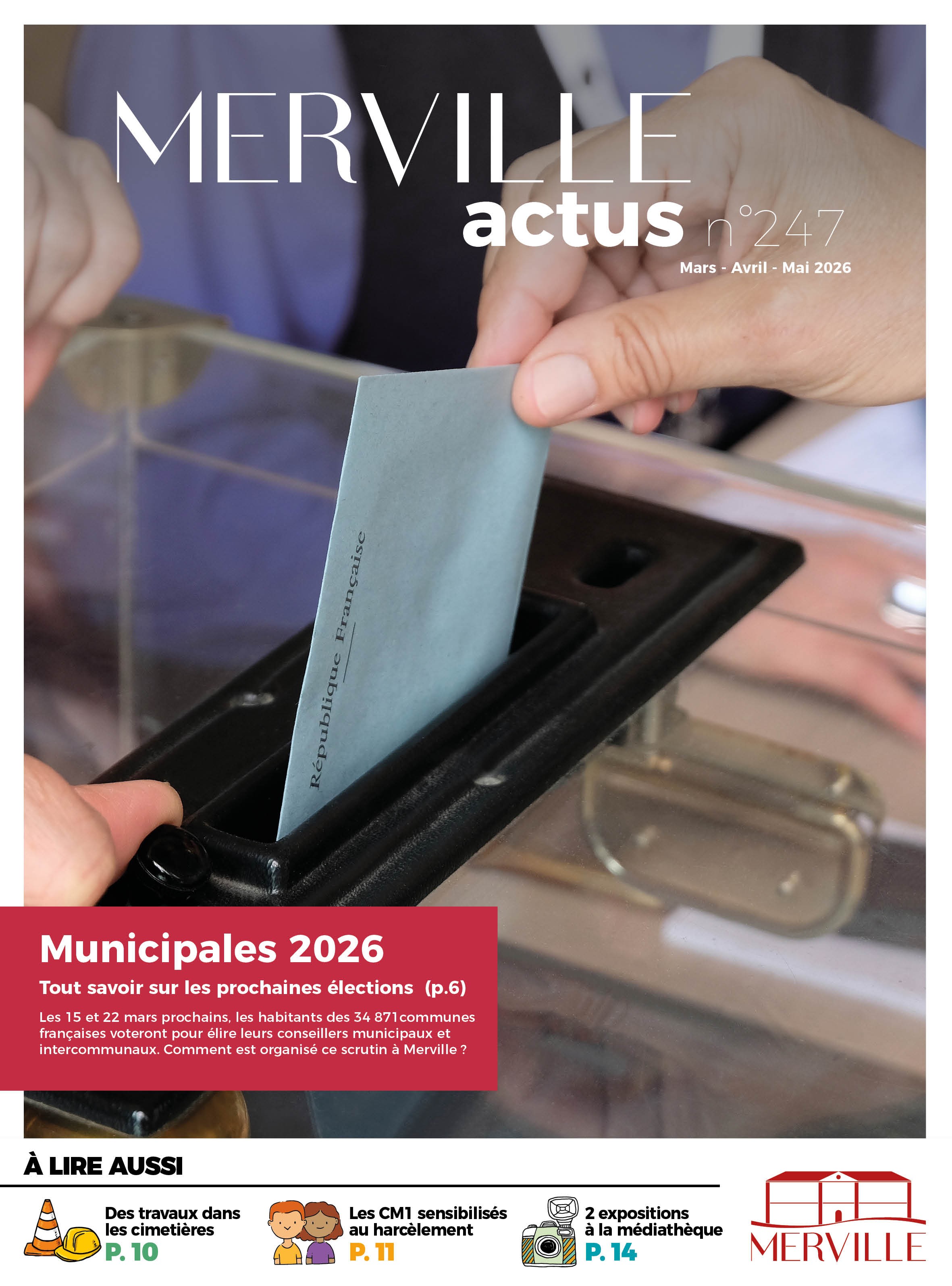 Tous les 3 mois, le Merville actus est distribué dans toutes les boites aux lettres des habitants. Dans ce bulletin municipal, retrouvez toute l'actualité de la commune, les projets en cours ou à venir, l'agenda des événements municipaux et associatifs !